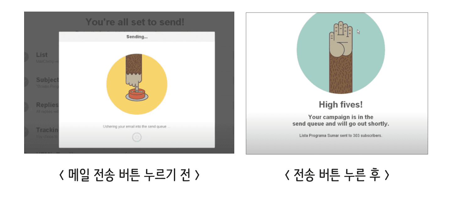 피크엔드의 법칙을 잘 활용한 대표적인 사례는 Mailchimp의 메일 전송 UX입니다.