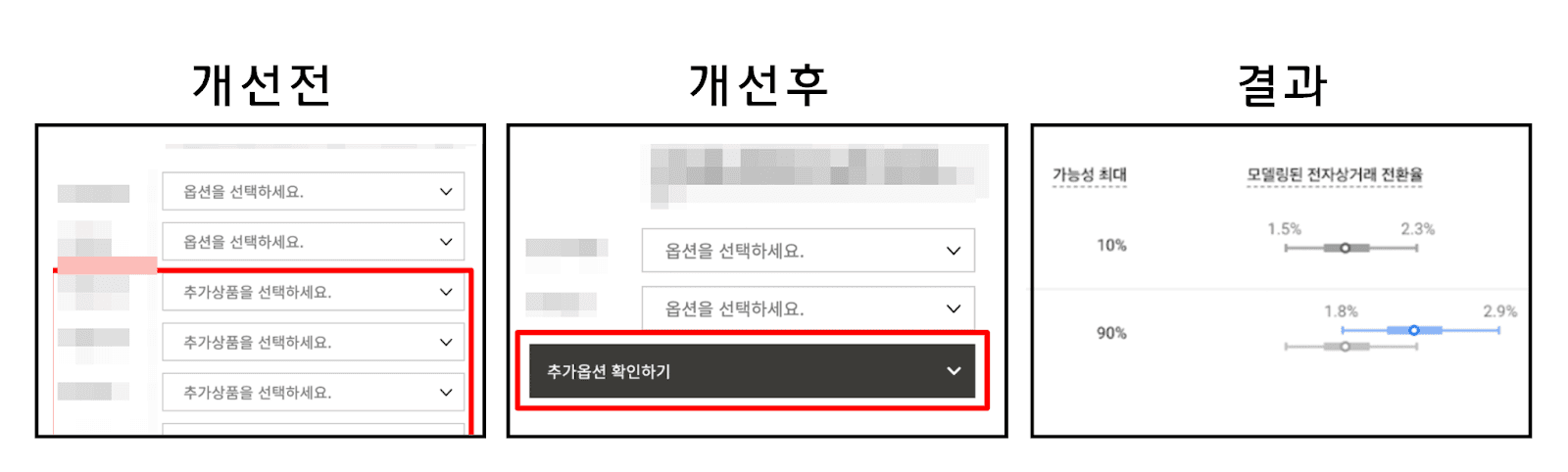 페이지 체류시간은 길지만 구매로 이어지지 않는다면, 방문자들이 고민하는 시간이 길기 때문일 가능성이 높습니다. 이 문제를 해결하기 위해 필수 선택지는 모두 노출하되, 선택 옵션은 숨겨서 사용자의 부담을 줄이는 방식을 적용했습니다.
