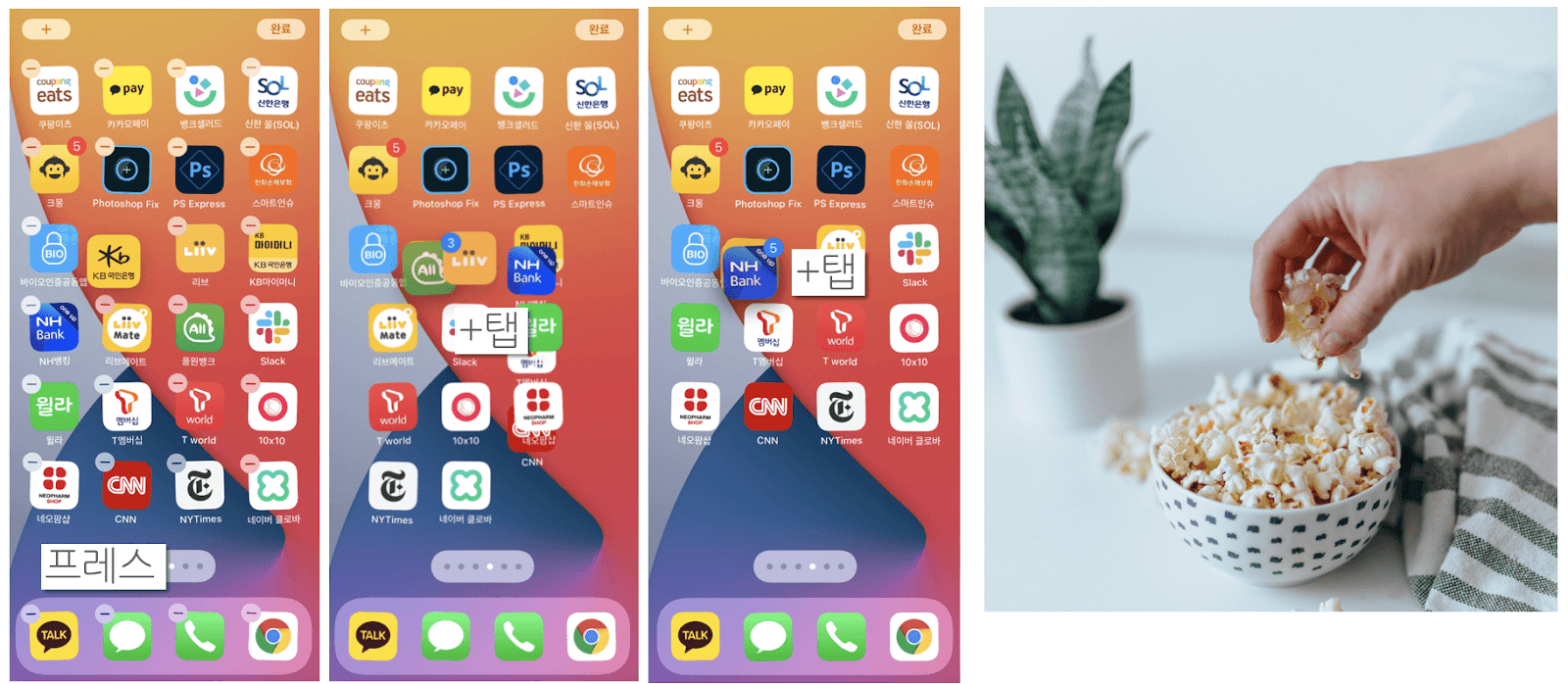 아이폰에는 특정 앱을 모아서 한 번에 옮길 수 있는 '프레스&탭' 기능이 있습니다. 이처럼 사용자가 직관적으로 이해할 수 있는 기능을 제공하는 것이 UX 설계에서 매우 중요합니다.