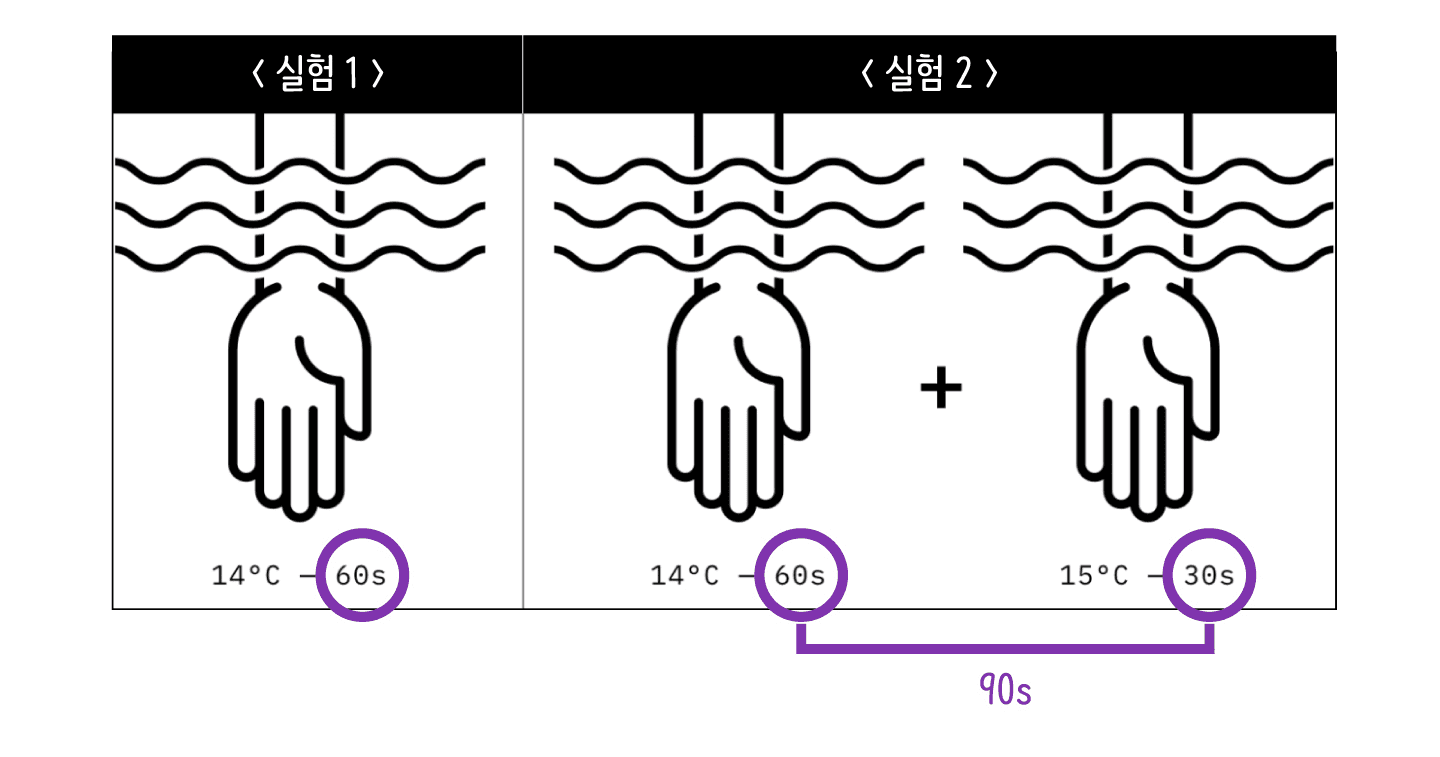 두 번째 실험: 14도의 물에 손을 60초 동안 담근 다음, 전보다 1도 높은 15도의 물에 30초를 더 담근다.